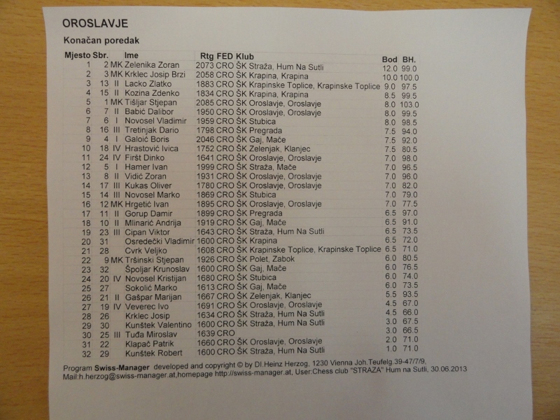 Po izrazito lošem vremenu( led na cestama),danas se u Oroslavju odigrao “Cup” grada, okupivši 32 igrača iz klubova KZŽ. Najuspješniji igrač bio je Zoran Zelenika iz ŠK Straža, osvojivši prvo mjesto sa 12 od 13 mogućih bodova, tj. 2 boda više od drugoplasiranog Josipa Krkleca iz ŠK Krapina, odnosno 3 boda više od trećeplasiranog Zlatka Lacko iz Krapinskih Toplica.(KR)